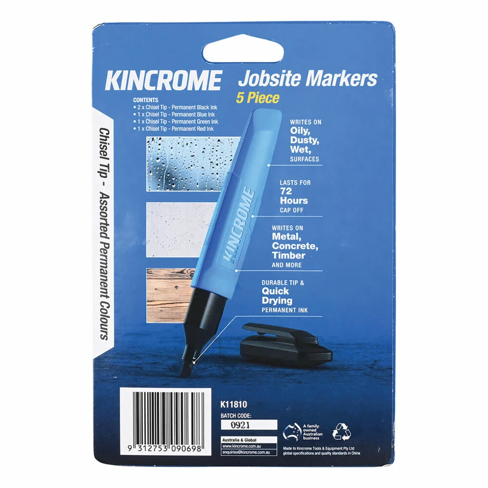 Kincrome markers are a great addition to any garage, workshop, woodshop or just around the home. Manufactured with ultra-durable tips available in fine, chisel and bullet variations, these markers will resist drying out even when left with the cap off for up to 72 hours.