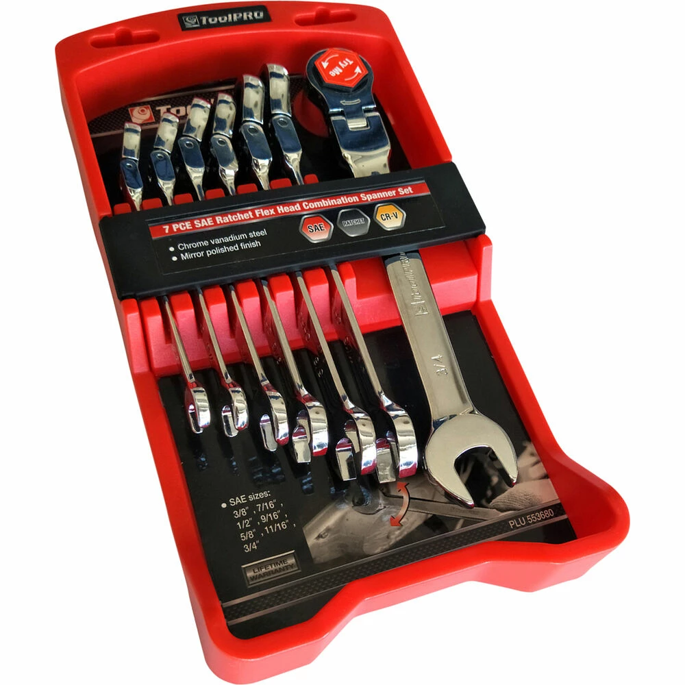 This set includes flex head ratchet style spanners that have the versatility of an open end spanner with a flex head ratcheting ring end to make life easier in those tight places. All of these spanners are now thinner and lighter than both older models (and a lot of their competition), which reduces user fatigue without compromising on durability. The full range of ToolPRO spanners are made from ultra-durable chrome-vanadium steel, and finished with a bright, mirror-like polish, making them practically immune from corrosion, and quite nice to look at. ToolPRO Spanners meet and exceed both DIN and ANSI standards, so you can be sure that they are sturdy enough to tackle any job you need done. And if that wasn’t enough, each spanner comes with a lifetime warranty giving you peace of mind over years of service in the workshop. Whether you need a single spanner for a particular bolt, you’d like a well-rounded set for general purpose use, or you’d really like to make your tool-wall sparkle, check out the full range of ToolPRO spanners.